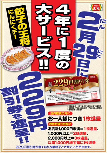 それに因んで、餃子の王将に今日行くと229円割引券がもらえるらしい